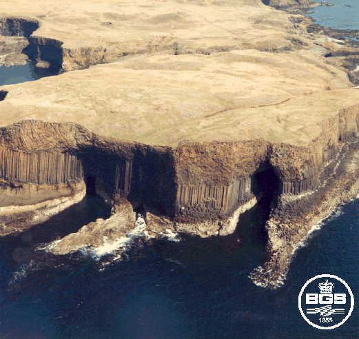 This photograph shows Fingal's Cave and the columnar jointing in Tertiary volcanic flows (click on it for a larger version). Staffa is three quarters of a mile long, one quarter of a mile wide, has a circumference of one and a half miles, an area of 71 acres, and is 135 feet high at its highest point.